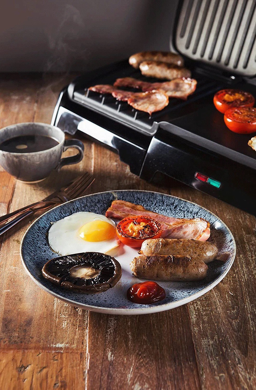 For breakfast have your sausages and bacon on the grill, while your fried eggs, tomatoes, mushrooms and hash browns are cooking on the griddle.